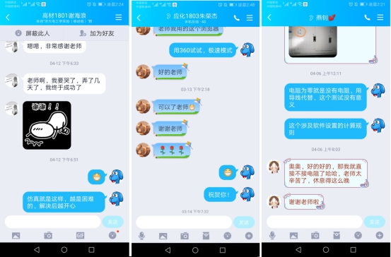 平台所面向的非电专业学生数目庞大,均为大学二年级学生,绝大多数是第一次接触仿真,软件的学习使用过程存在较大困难,对虚拟教学工作的开展是极大的挑战。除了保障网络平台运行外,实验中心教师克服各种不利因素,昼夜答疑,培训课代表辅助教学。方会老师在群内每天回复几百条信息,确保了每一位遇到困难的同学得到正确结果,做好理论课“主播”的“客服”工作。