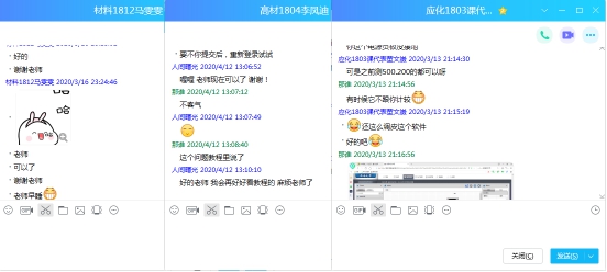 和专业的同学之间的交流,还大大减轻了老师的答疑压力,例如化工1802班张增胤同学、机工1803班张荣成同学、材料1809班林巧雯同学、材料1814班张洁同学、车辆1801班刘雪同学、高材1803班刘雪同学、高材1805班尚永蔚同学等等,他们用更接地气的语言向同学描述着各种操作,为学习群营造了轻松的氛围。