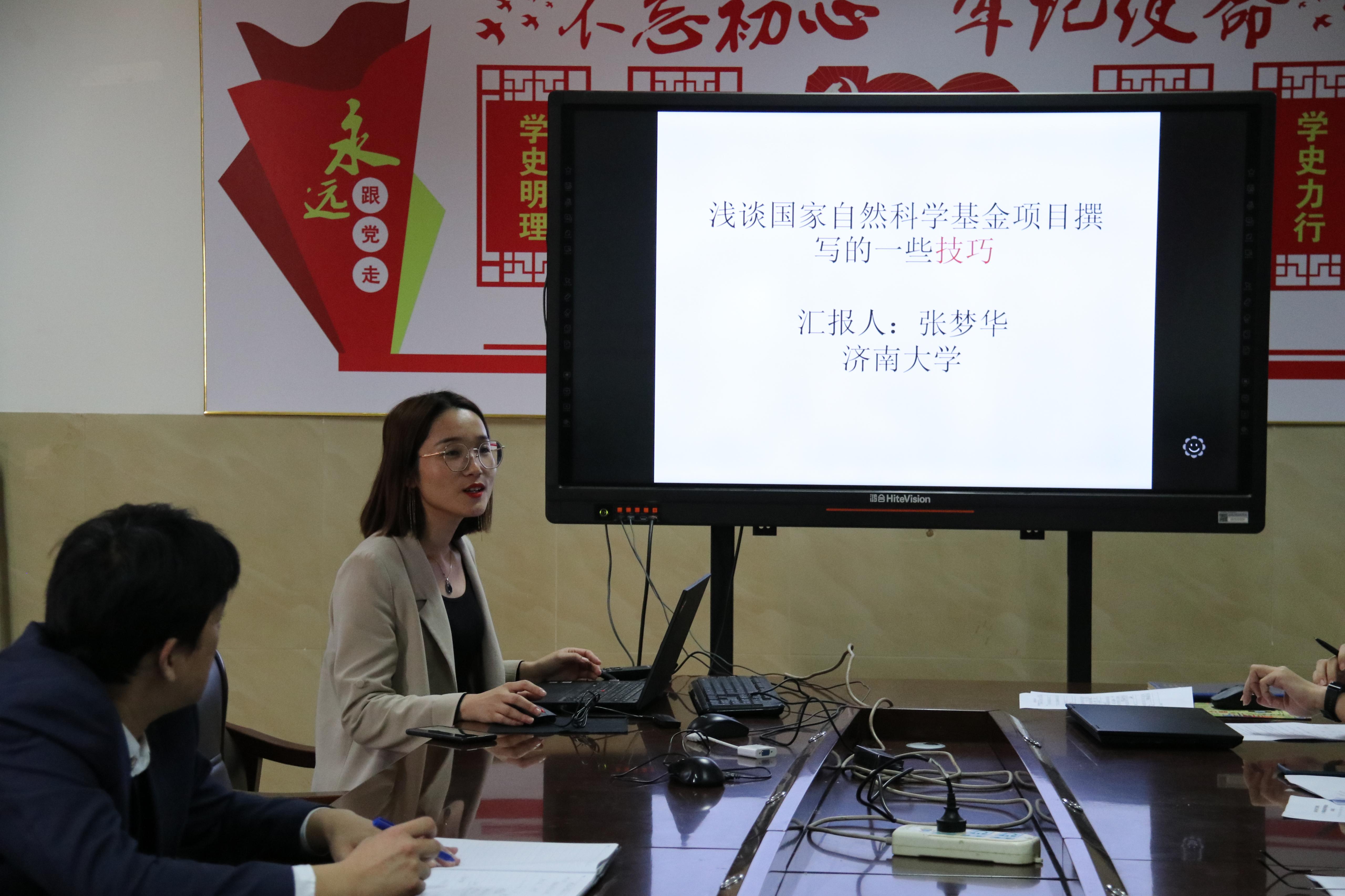 教师代表张梦华博士、于刚博士分别围绕选题凝练、论证细节、技术路线归纳、研究方法论述等方面介绍了国家自然科学基金申报经验,着重讲解了如何规避同质化命题、如何在总结同行研究成果之上独辟蹊径找到具有原创性的思路、如何精炼准确地撰写申报书主体内容、如何总结个人研究基础以突出亮点等关键问题。