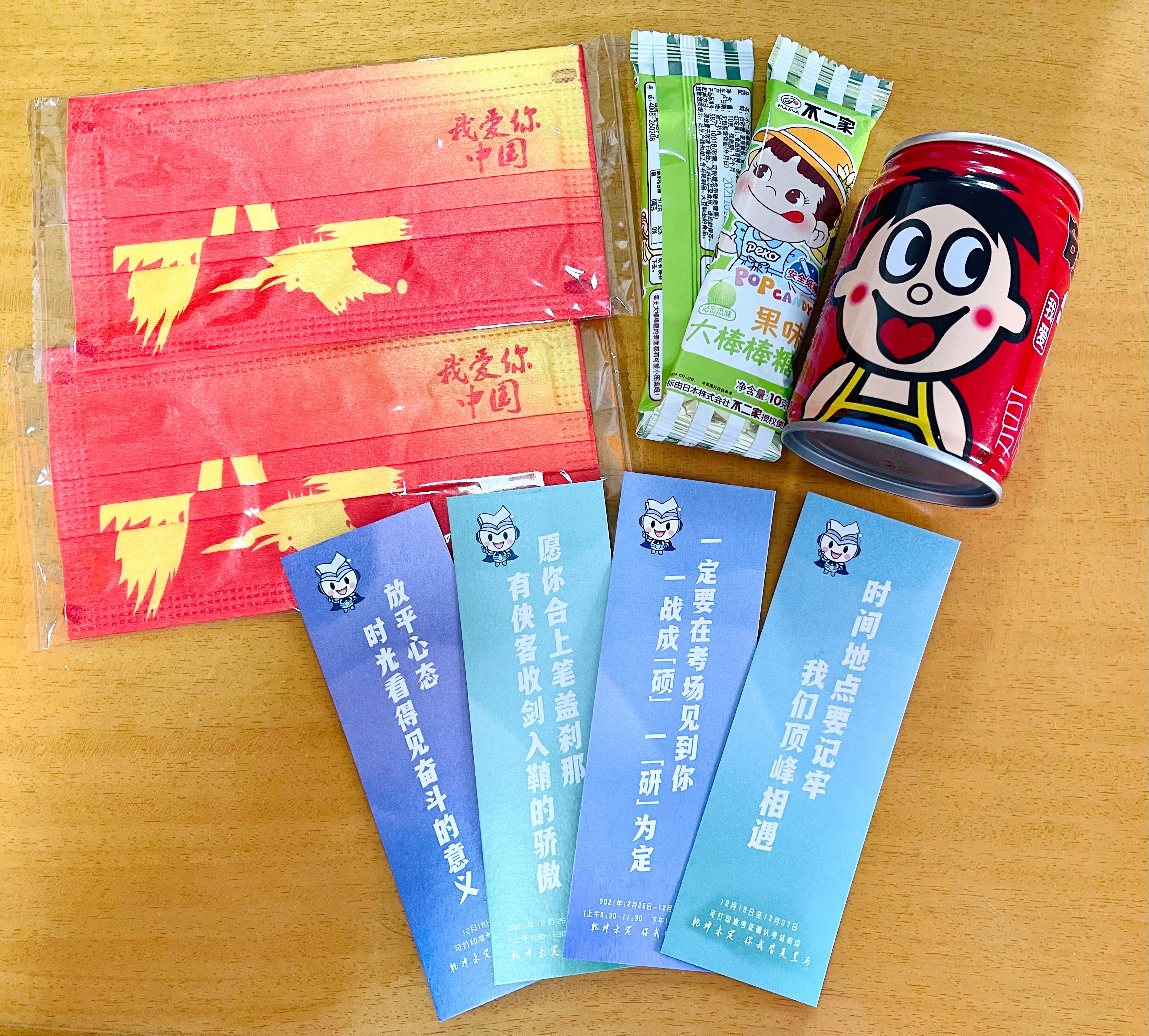为同学们赠送了“考研大礼包”,中国红口罩寓意“红红火火”,旺仔牛奶寓意“诸事旺旺”,棒棒糖寓意“棒上加棒”,定制书签上印有打印准考证时间、考试时间等考试相关信息,提醒同学们不要忘记关键时间节点。