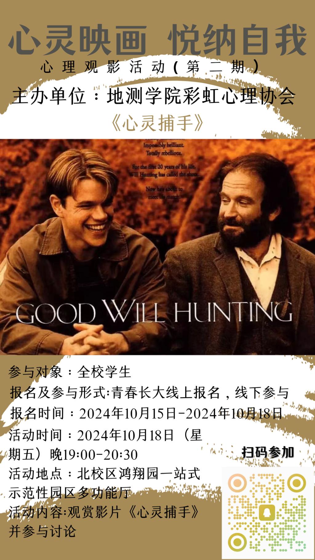 影片简介:《心灵捕手》讲述了一位年轻数学天才在心理咨询师帮助下,逐渐打开心扉,面对并克服内心恐惧与创伤的故事。影片不仅展现了数学之美,更深刻探讨了人性的复杂与脆弱,以及爱与救赎的力量。本次活动旨在通过影片的放映与深度解读,激发观众对自我认知、人际关系及生命意义的深刻思考。