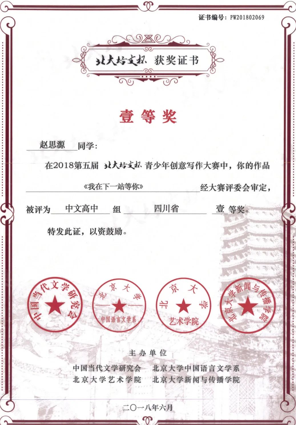 文学社第三届黑与白征文比赛全校一等奖(总分第一名),2023年6月,他的小说《天堂向晚》荣获澳门金沙娱乐城app