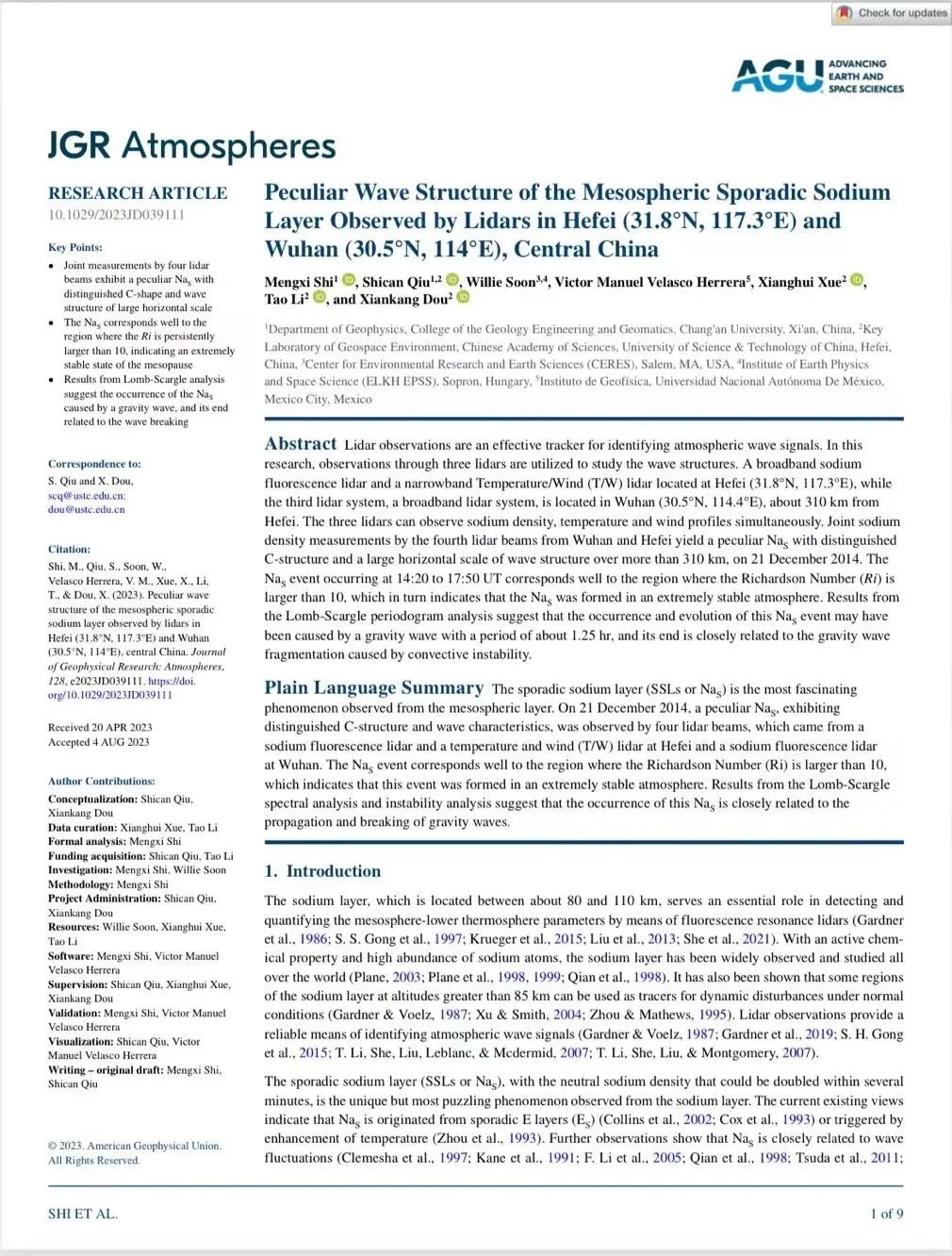依托国家自然科学基金面上项目(基于子午工程激光雷达的突发钠层新机制研究),他以第一作者在《Journal of Geophysical Research: Atmospheres》上发表了题为“Peculiar Wave Structure of the Mesospheric Sporadic Sodium Layer Observed by Lidars in Hefei (31.8°N, 117.3°E) and Wuhan (30.5°N, 114°E), Central China”的学术论文, 《JGR: Atmosphere》是地学领域高质量科技期刊分级T1期刊、自然指数(Nature Index,NI)选取的68种世界一流科技期刊之一,是中国科澳门金沙娱乐城app