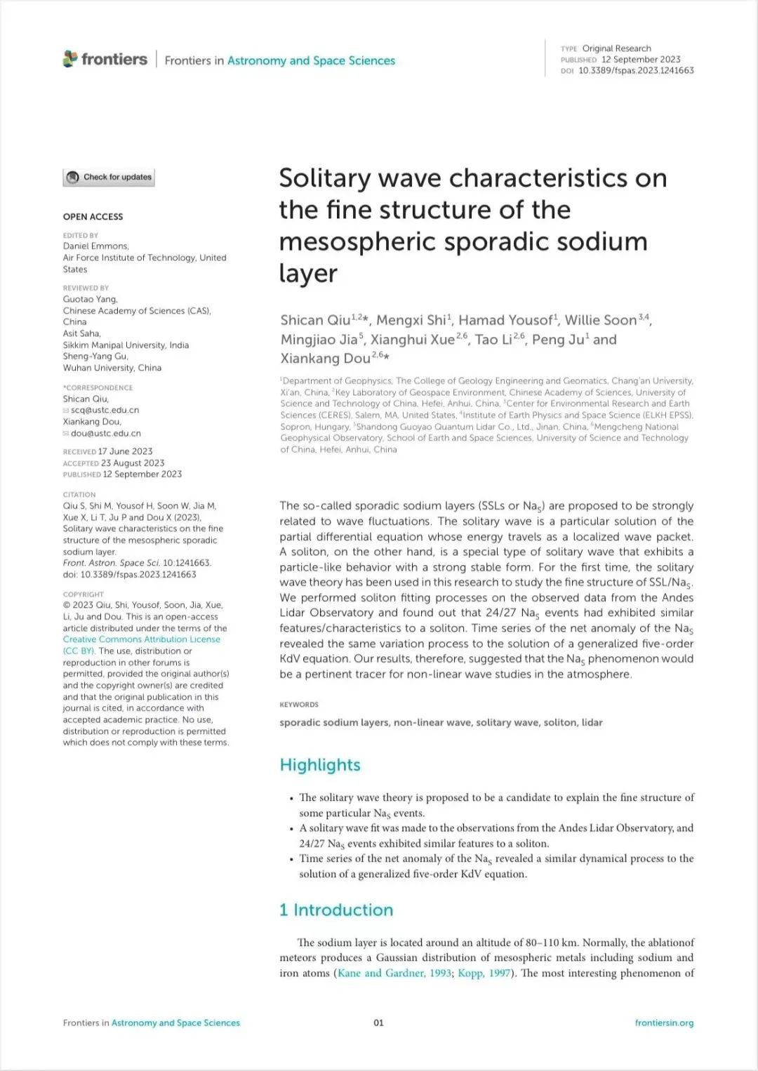 三区期刊《Frontiers in Astronomy and Space Sciences》上发表的论文首次提出孤立波可能是突发钠层的成因的观点。