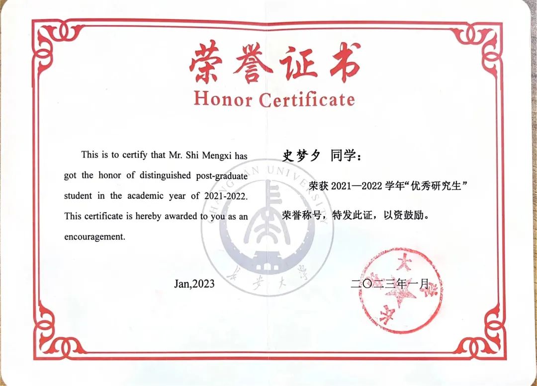 2021年度一等学业奖学金、2022年度一等学业奖学金、2023年度国家奖学金、2023年度山东高速奖学金。