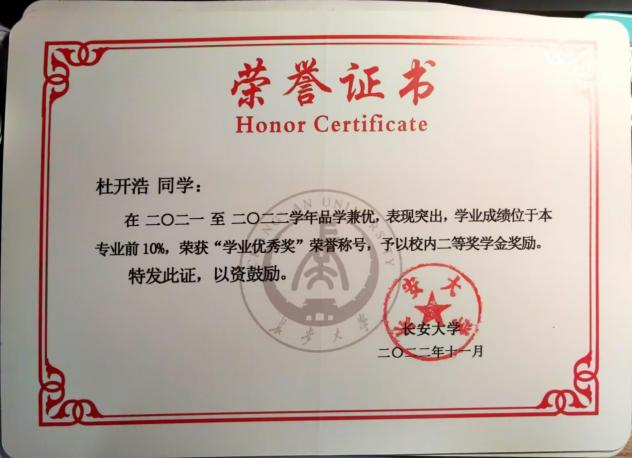 在大一、大二学年中,严格要求自己,因为有明确的目标和知识的强烈追求,刻苦学习,牢固掌握了专业知识和技能,两年专业排名第1,并连续两年获得国家奖学金。在此期间,还获得校园贡献奖、课程优秀奖、学业优秀奖等奖项。
