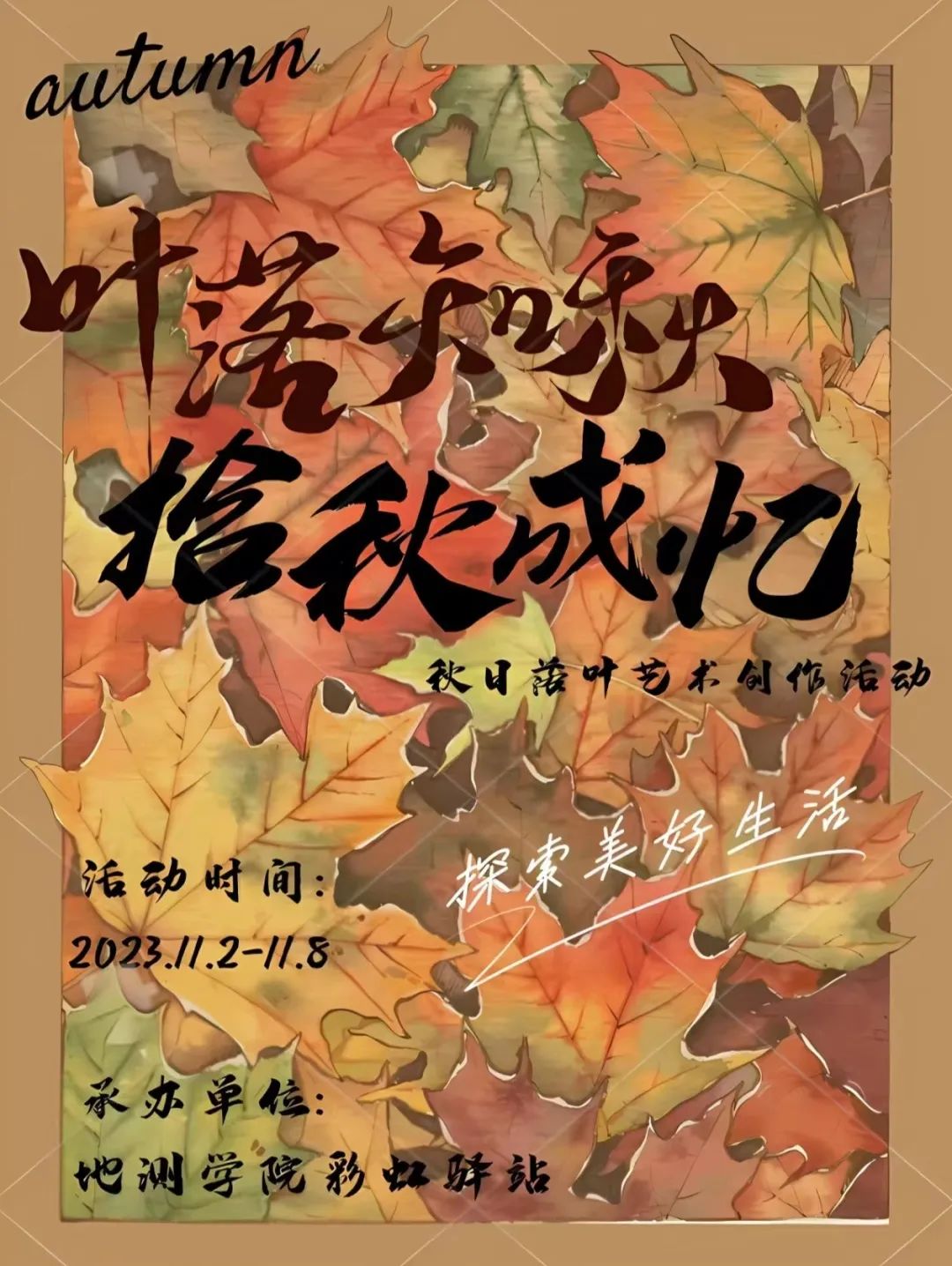逐渐变黄、掉落、干枯的叶子诠释着厚重与温暖,亦有一份喧闹过后归于平静的安详。叶落归于根、落于土的死亡不是终点,而是生命的另一种延伸。本次活动旨在提高同学们的动手能力,以及对自然的感知能力,陶冶自身情操,为同学们的大学生涯增添一份精彩瞬间,留存一份宝贵回忆,让同学们对2023年的金秋长大记忆深刻,让这个秋天更有意义!