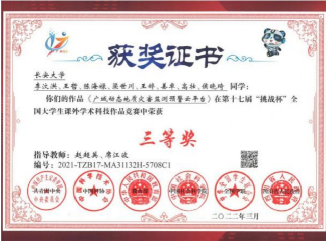 参赛作品《广域动态地质灾害监测预警云平台》荣获三等奖;在第十七届“挑战杯”全国大学生课外学术科技作品竞赛“黑科技”专项赛中,澳门金沙娱乐城app
