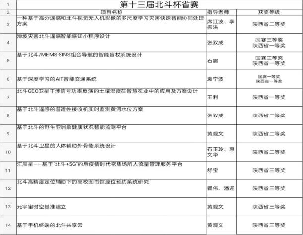 景策等同学的作品《无人机投放式北斗滑坡监测预警系统》获“星系”级作品(特等奖)。在第十一届“挑战杯”陕汽集团陕西省大学生创业计划竞赛中获得金奖、银奖各1项;在第十三届“挑战杯”中国大学生创业竞赛决赛中,《“北斗地哨”——地质灾害隐患识别与监测预警响应系统团队》的作品团队荣获三等奖。