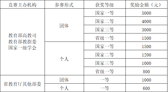 对参加教育部高等教育司、教育部各教学指导委员会(或国家一级学会)和省教育厅、其他部委主办的竞赛获奖者进行奖励,具体奖励标准参照下表执行。