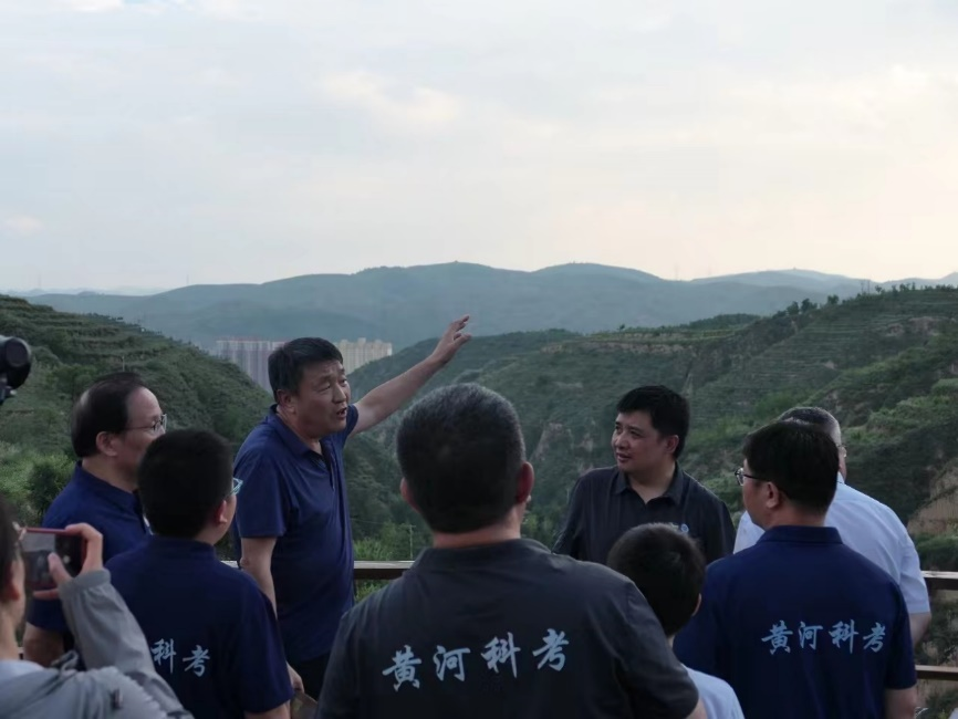 工作人员为科考队员讲解辛店沟水土保持工程的发展历史