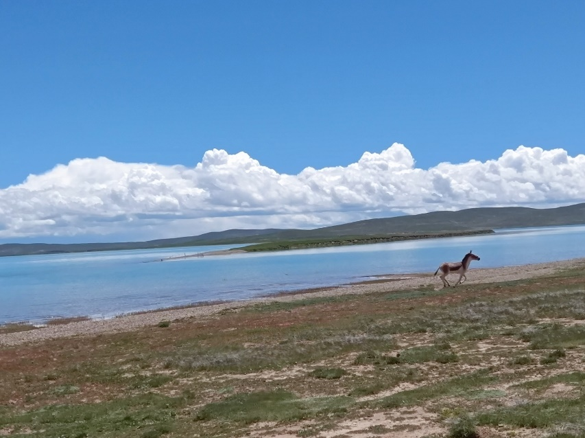 藏野驴在黄河源园区鄂陵湖旁觅食