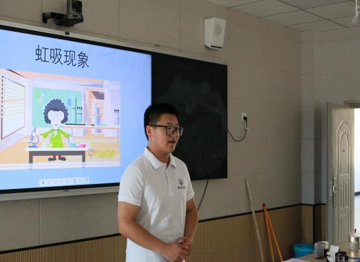 实践队科普实验小组进入北辰小学录播教室实地演练了6个“水的趣味实验”。通过这一环节,队员们熟悉了演示环境,试用了教室教学工具,最终敲定了实验流程和其他细节工作。