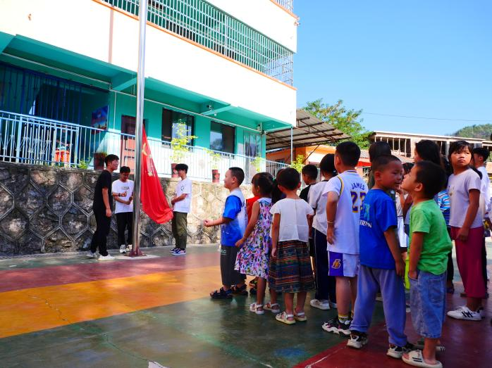 筑梦黔行队与30余位孩子们进行了庄严的升旗仪式。迎着支教课程开始的第一缕晨光,升旗仪式正式开始,旗杆旁,澳门金沙娱乐城app