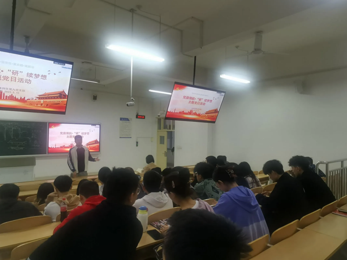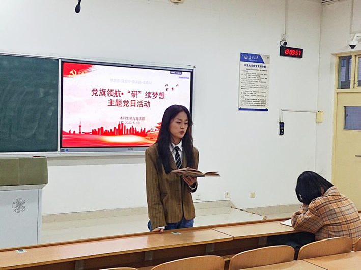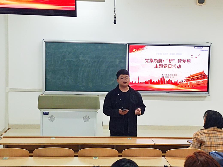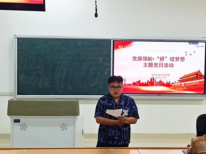 为扎实开展主题教育系列活动,充分发挥党支部和学生党员的先锋模范作用,本科生第九党支部于5月10日在鸿远2303教室召开“党旗引领·研续梦想”主题党日活动,支部全体党员、辅导员余智勇、思政班主任杨梦瑶和部分低年级本科生共同参与此次活动。活动由支部副书记左晓文主持。