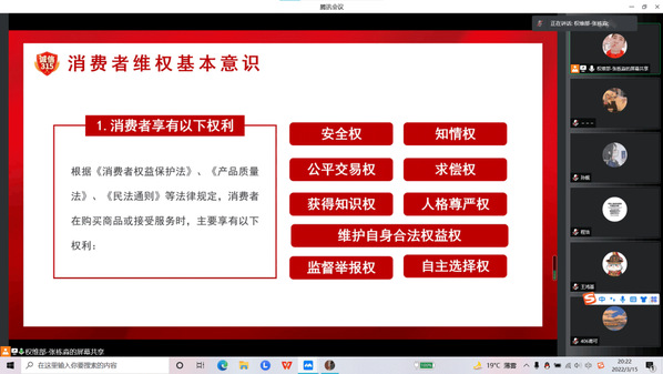会议中,主持人张栋淼就“国际消费者权益日”的发展历史进行介绍,分别从国际消费者权益日的发展历史,消费者权益保护日的设立宗旨,与消费者维权基本意识三个部分展开宣讲,强调了如今的3•15是一个饱含着公理与正义标志,也是传递平等与诚信理念的声音。