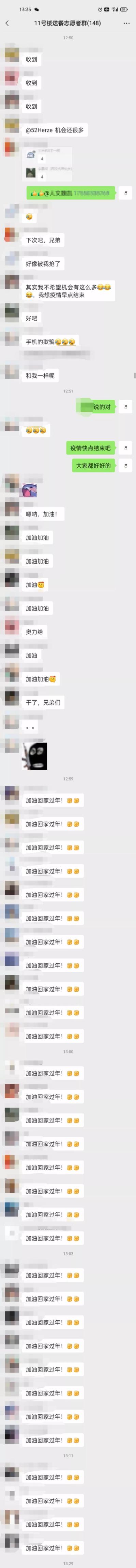 从12月17日开始,我和海城老师便带领100多名志愿者开始了11号公寓楼1000余名学生一日三餐的配送生活,全校辅导员们大多由于密接被隔离,人手越来越少,而我也荣升为11号公寓楼的“楼长”,全面负责11号楼所有学生的生活保障和核酸检测。在这期间,志愿者们很给力,能够确保事事有回应、件件有着落;这几天的一线工作,我们经常会听到“老师,我还没送过,给我个机会”“老师,我力气大,我先来”“老师,我已经熟练了,我要持续在一线”,志愿者们的故事一次又一次的感动了大家,特别是制动学生越来越多,志愿者人手不够的时候,女生们也主动站出来,“老师,我没有问题,我可以送”,很多平时在家都不干重活的女孩子也在校园里面抬着餐盒,去给制动的男生送餐,有些男生给我说,“我实在不好意思让女生给我送饭,我真的好想出去当志愿者”。还有大四马上考研的学生说“老师,考研结束我马上来当志愿者”。