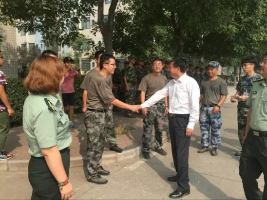 党委副书记滑思忠、辅导员邵龙、程耀等老师时刻守护在军训第一线,随时检查军训情况,并与学生交谈。