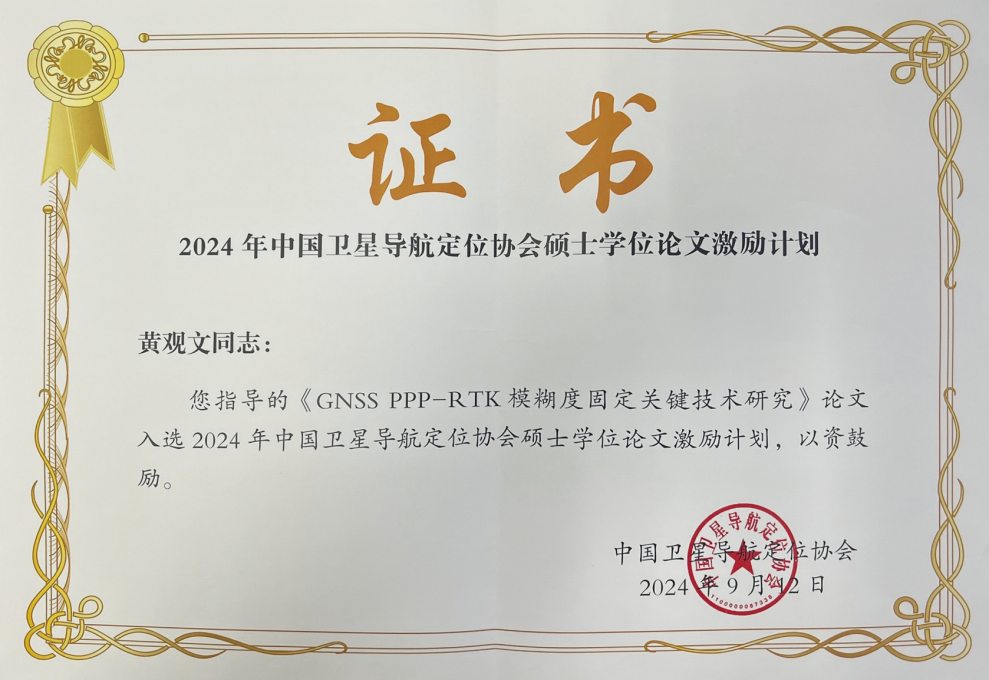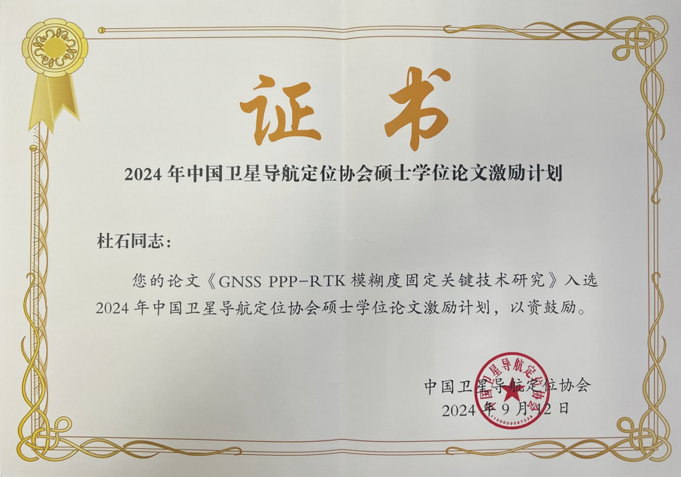 2022届硕士研究生杜石的学位论文《GNSS PPP-RTK模糊度固定关键技术研究》成功入选2024年度中国卫星导航定位协会硕士学位论文激励计划,指导老师为黄观文教授。