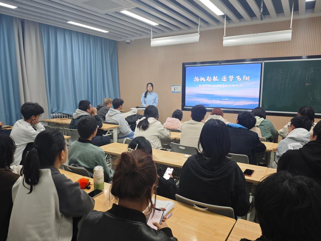 于11月8日在修远教学楼举行2024级学生干部培训会,2024级本科生辅导员刘永旭、阚红淼和2024级各班班长、团支书参加,会议由刘永旭主持。