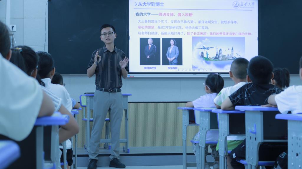 随后,长安大学沈伟副教授面向四年级全体学生,以《我的求学之路》为题,分享自己25年的个人成长故事与求学心得。“Where there is a will,there is a way”(有志者,事竟成)沈老师朴实的话语在孩子们心中播下探索科学的种子。