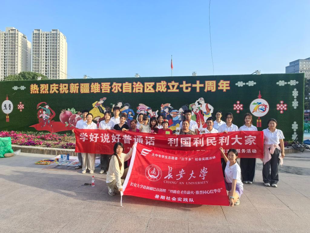 长安大学赴新疆焉耆“丝路育才传薪火,推普同心绘华章”暑期社会实践队于7月20日晚,在新疆巴音郭楞蒙古自治州焉耆回族自治县人民广场开展“学好说好普通话,利国利民利大家”主题推普活动,以青春力量践行语言文字推广使命。此次活动是为落实国家语言文字事业发展的重要战略部署,旨在助力新疆文化教育发展,铸牢中华民族共同体意识。