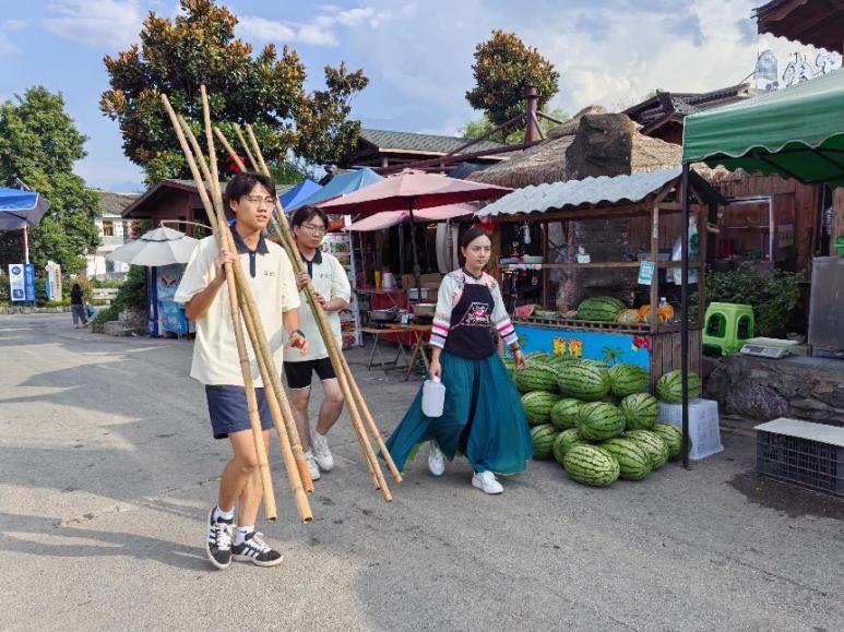 午后,实践队投入到篝火晚会的紧张筹备工作中。队员们与村民们齐心协力搬运柴薪、精心布置场地,确保晚会顺利举行。在现场,队员们还主动承担起安全维护职责,在篝火点燃前后耐心引导观众保持安全距离,及时提醒带小孩的家庭注意避让,有效保障了活动的安全有序。