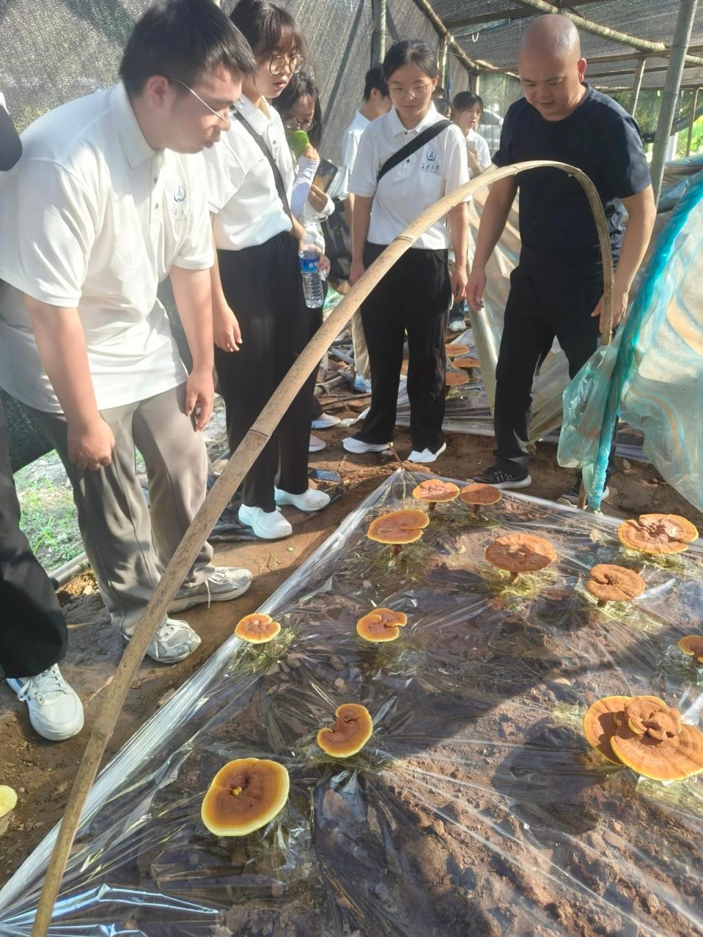 次日,实践队首站抵达青山镇。在青山绿水现代农业园区内,队员们深入菌棒车间、踏足灵芝大棚,亲眼见证“药食同源”如何将朽木化为宝贵资源;在光伏板下,大家深切体会“农光互补”立体模式的绿色脉动。随后,在党性教育基地,指导老师杨海城引领团队成员重温入党誓词,青春的誓言在青山之巅久久回荡。