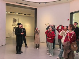 活动当日,师生一行走进陕西历史博物馆秦汉馆,沉浸于浓厚的秦汉文化氛围中。在讲解员的引导下,大家依次参观了“秦帝国的崛起”“汉风飞扬”等主题展区。从雄浑的秦兵马俑到精巧的西汉鎏金铜蚕,从蕴含军事智慧的杜虎符到再现生活图景的汉彩绘陶院落,每一件文物都如同一页鲜活的历史。除静态观赏外,馆内的科技互动区同样引人入胜。在“科技赋能文物”展区,大家围站在半球形投影幕前,体验了一场关于星空的互动之旅。随着指尖在模拟星盘上轻点,星宿依次亮起,二十八星宿的运行轨迹跃然眼前,以现代方式直观感受古人的宇宙观与天文智慧。