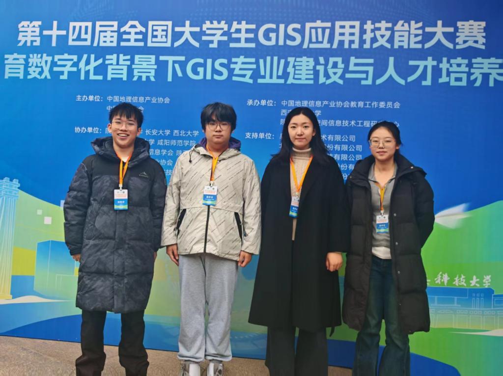 的四名学生(张凯洋、刘天昊、吴烨楠、张梦茹)联合组队,在指导教师赵建林和吴田军的携手带领下,在首届全国大学生GIS应用技能大赛陕西省邀请赛中荣获特等奖,并在此次全国大赛中荣获二等奖。