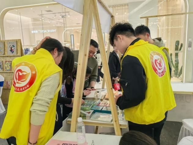 的志愿者们早早到达现场。上午9时前,他们在济南市图书馆(中心馆)集合完毕后,便前往弘阳广场布置会场。男生志愿者负责搬运和摆放货架、移动摊位,女生志愿者则精心装饰舞台、张贴MBTI主题卡片,过程中还有一名志愿者负责拍照记录。现场布置完成后,鉴于广场人流量大,四名志愿者迅速投入到现场秩序维护工作中,其余志愿者按要求对接各自负责的摊位,并抓紧学习相关知识。