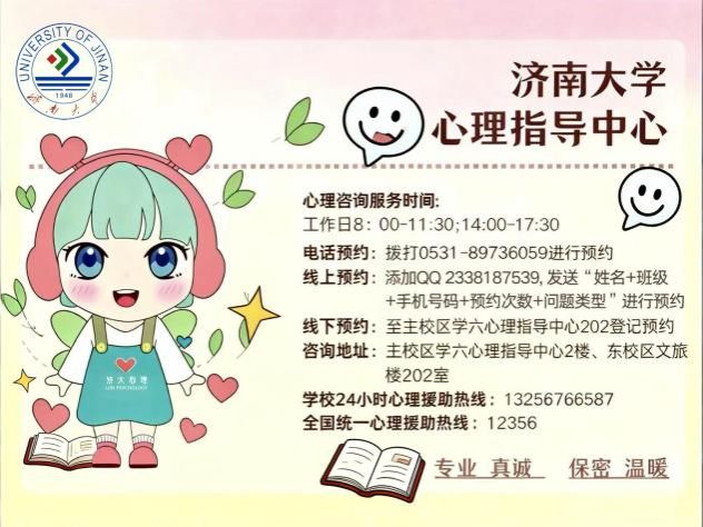 心理指导中心一直关注同学们的身心发展,致力于为大家提供专业、温暖的心理支持。无论是在生活中遇到困扰,还是在学习上感到压力,都可以随时联系心理指导中心,让专业的心理咨询为你解忧,助你以更阳光的心态迎接大学生活的每一天!