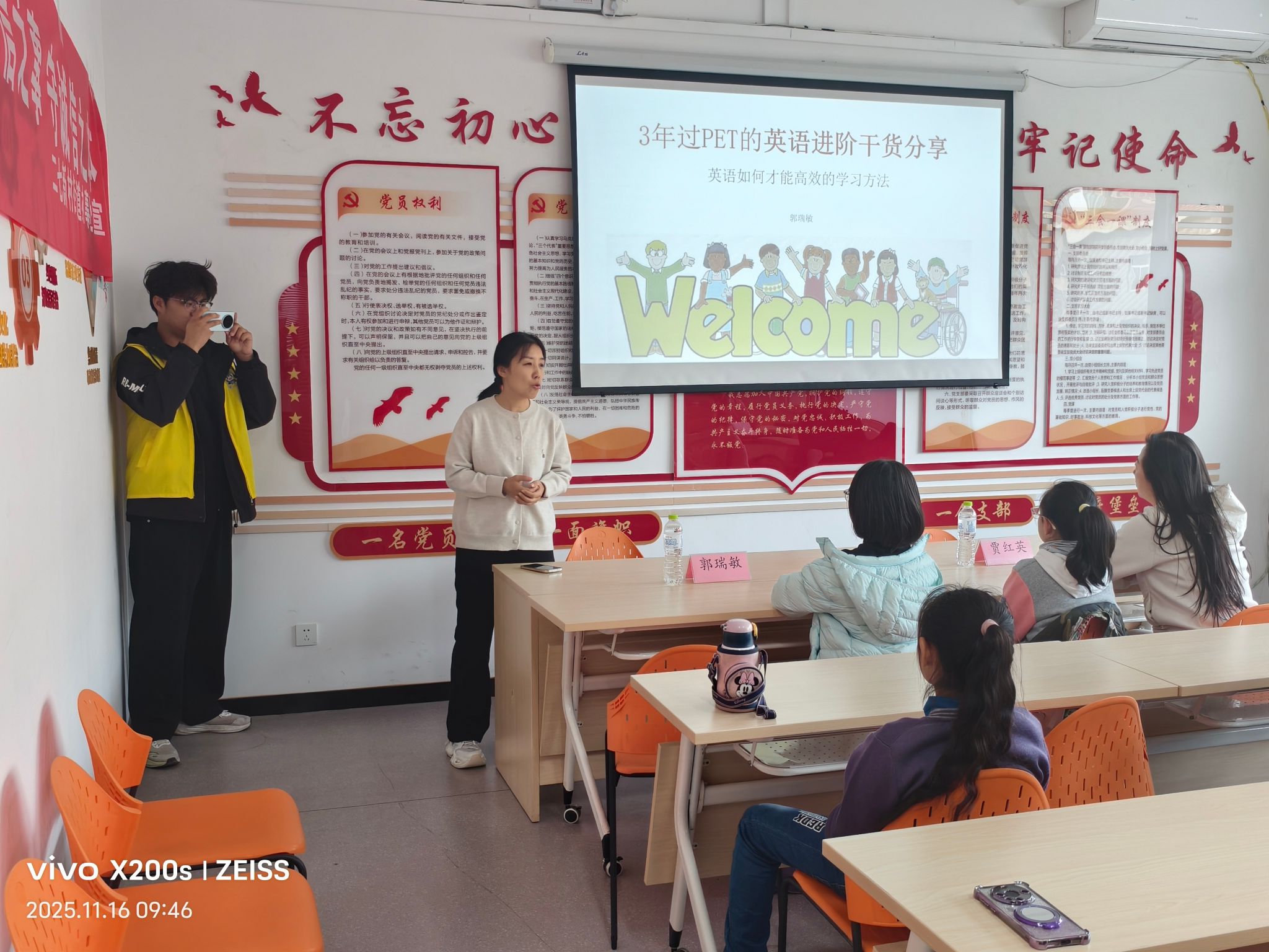 上午9时30分,英语讲座正式开始。志愿者们分工明确、配合默契:一人全程协助讲师进行PPT翻页,保障课堂节奏顺畅;另一人聚焦讲师授课、学生互动等关键环节,按要求拍摄记录,每人完成不少于二十张的活动照片,全方位留存活动精彩瞬间。讲座过程中,志愿者们始终保持专注,主动配合社区工作人员维持现场秩序,为青少年和家长营造了有序高效的学习氛围。活动结束后,全体人员合影留念,定格志愿服务的温暖时刻。