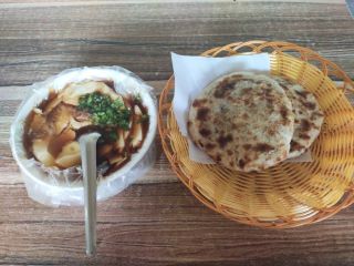 帮着火烧铺子老板忙活了一早上的我们,终于也得空坐下来,点两个外酥里嫩的肉火烧,配上黏咸粥或者是豆腐脑,品尝着在潍坊人心目中难以撼动的早餐。