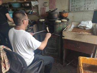 时间转眼来到了七点钟,忙活了一早上的火烧铺开始变得清闲起来,老板也开始敞开心扉与我们调研组交谈,“这传统的肉火烧啊,最广为人知的就是咱这城隍庙肉火烧,正宗的火烧必须用咱这种炭炉子烤,”,他一边说着一边熟练的翻动着炭炉子里的火烧,“传统的炉子是圆筒形的,上面是圆形平锅,下面是烤箱,炉子壁是用地里的泥巴做的,烤箱中间是个圆形的炭火炉,里面铺满大小均匀的煤炭,外围是个环状的平锅,在炭火的温润下,肉火烧往外滋滋冒着油,浓浓的肉香透出烤炉,这样做出来的火烧味道才更加鲜美,充盈着满满的家乡味道。”