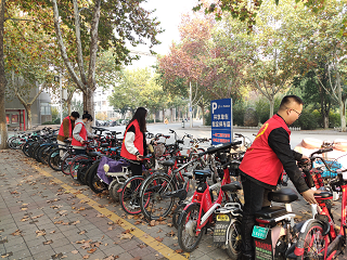 号召,特别是校园环境保护志愿服务活动。当天,志愿者队伍准时到达指定服务地点,志愿者乐于奉献,个个眼明手快,干劲十足。有的两人抬一辆,有的一人扛一辆,有的寻找遗漏在草坪上的旧车,有的积极寻找合适的摆放地点,大家忙碌的身影,俨然成了校园一道亮丽的风景线。经过整理,10教楼前自行车摆放得整齐有序,停车区域环境有了明显的改善。