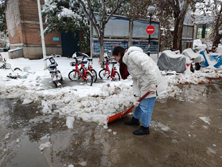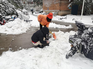 面对积雪这块“硬骨头”,研究生支部党员和积极分子拿起铁铲,与其他校园组织团结协作,将广场上的大部分积雪铲至路边,对已经结冰的难清理的积雪铲至排水系统附近。经过大家的齐心协力,通向第一、二教学楼的主要道路已被打通,广场上清理出一部分供师生行走的路面,有效的保证了大家的安全。