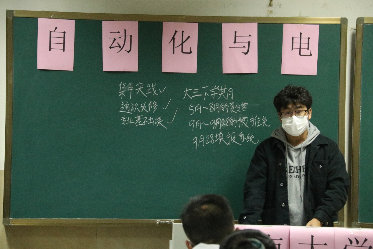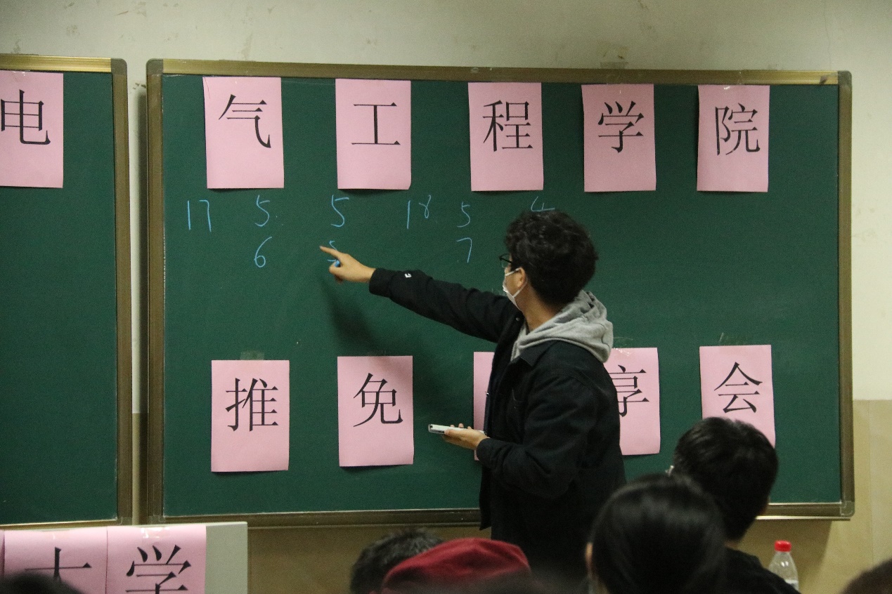 本次活动邀请到了2019级获得推免资格的学生代表,分别是朱鑫鑫和徐志强。其中,朱鑫鑫学长成功推免至山东大学。他首先给学弟学妹们讲了有关推免的基本流程和具体时间点,重点强调了,每位要想要申请推免的同学都需要提前了解推免的流程,做好自己的规划,尤其是新生更应提前寻找一个适合自己的目标,并为之奋斗努力。徐志强学长成功推免至华北电力大学,他从如何准备推免、选取推免澳门金沙娱乐城App