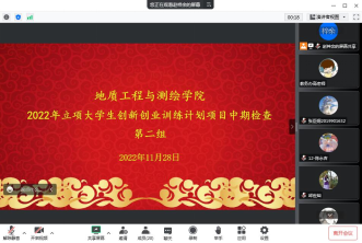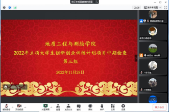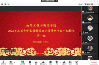 于2022年11月28日14:00-18:00,通过腾讯会议在线评审会的方式,对2022年77个大学生创新创业训练计划项目进行中期检查。地质工程系主任李萍、副主任成玉祥、副主任曹琰波、测绘科学系副主任杨耘、副主任张双成,地球物理系邱世灿老师、测绘科学系石震老师、安全工程系李艳、崔福庆老师担任评委,澳门金沙娱乐城app