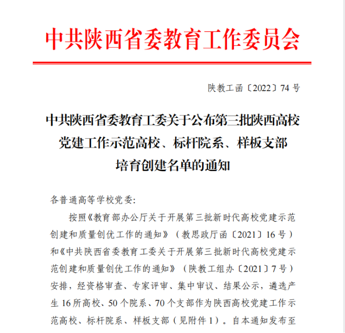 日前,中共陕西省委教育工委发布了《中共陕西省委教育工委关于公布第三批陕西高校党建工作示范高校、标杆院系、样板支部培育创建名单的通知》,澳门金沙娱乐城app