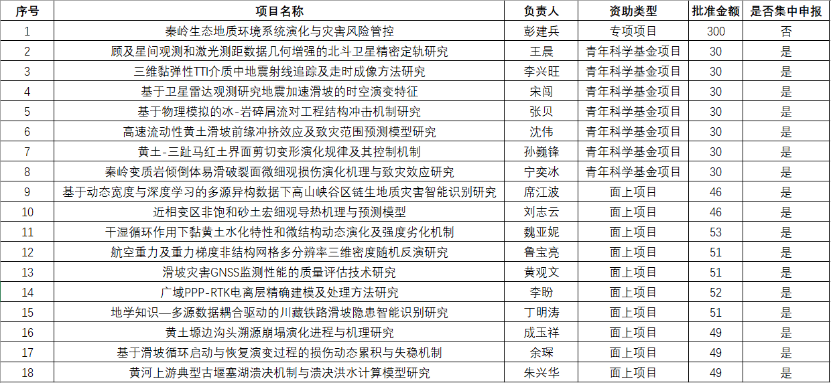 2023年度国家自然科学基金项目共获批18项,彭建兵院士获批重点专项项目1项,集中获批面上项目10项,青年基金项目7项,资助项目经费总额1007万元。