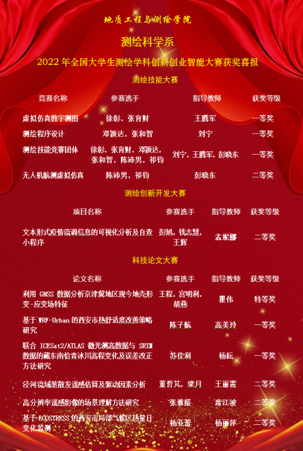测绘专业教学指导委员会和中国测绘学会教育委员会(以下简称“两委会”)在官方网站公布了“2021年全国高校大学生测绘类系列竞赛”的获奖名单。长安大学取得了特等奖1项,一等奖5项,二等奖5项的好成绩。