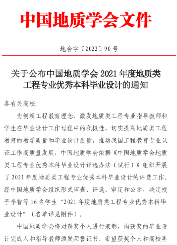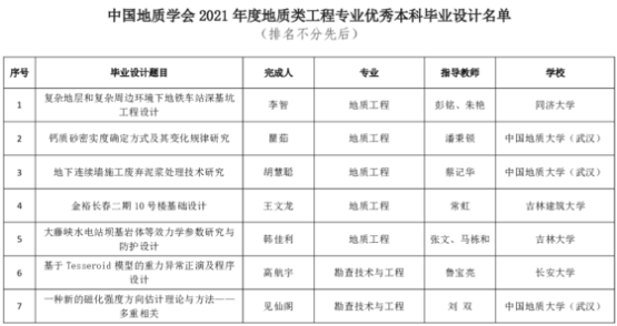 为创新工程教育理念,激发地质类工程专业指导教师和学生在毕业设计工作过程中的积极性,切实提高地质类工程教育的教学质量和毕业设计质量,推动我国工程教育专业认证工作高质量发展,中国地质学会面向全国地质类工程专业开展优秀本科毕业设计评选工作。本次中国地质学会共收到全国地质类各专业推荐的优秀本科毕业设计候选材料共计85份。根据《中国地质学会地质类工程专业优秀本科毕业设计评选办法(试行)》,经形式审查、初评、终评等环节,共评选出16份优秀本科毕业设计。