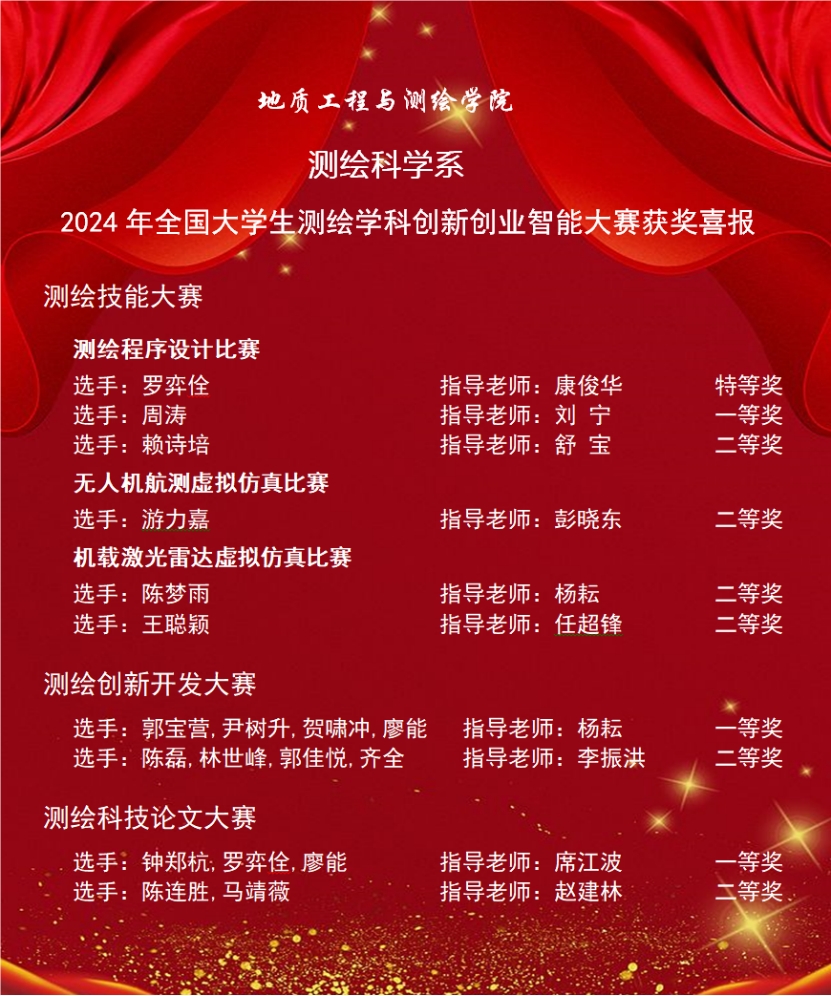 测绘专业教学指导委员会和中国测绘学会教育委员会(以下简称“两委会”)在官方网站公布了“2024全国大学生测绘学科创新创业智能大赛”的获奖名单。长安大学取得了特等奖1项,一等奖3项,二等奖6项的好成绩。