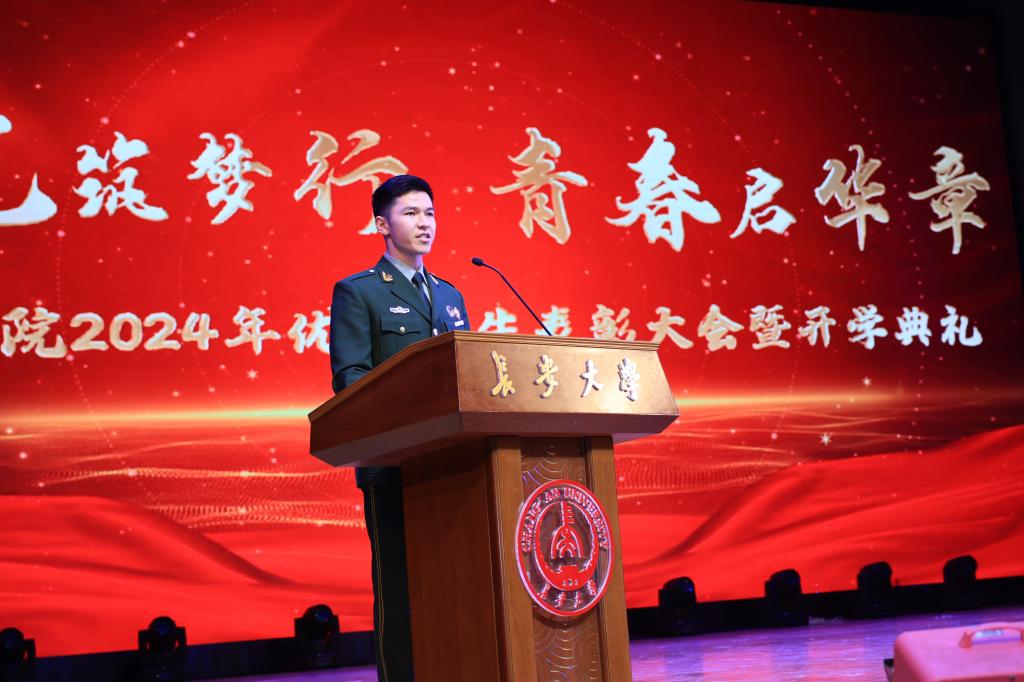 获奖学生代表霍加恩别克·海拉提别克回顾了自己戎装戍边的军旅生涯,用实际行动诠释了责任与奉献,他寄语2024级新生要彰显新时代长大学子的责任与担当,在奋斗中实现青春理想。