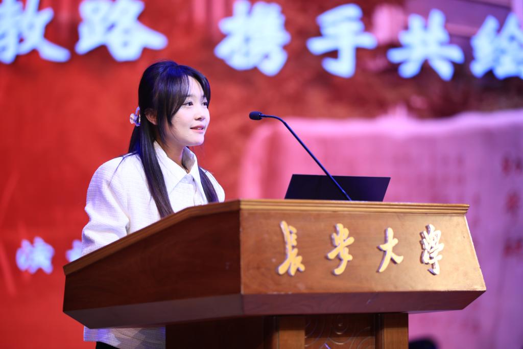 长大之星(团队)“丝路助人·筑梦·铸牢”团队成员侯晓庆作“青春筑梦支教路 携手共绘民族情”主题宣讲,她勉励2024级新同学勠力同心、拼搏进取,在奉献中实现自我价值,在铸牢中华民族共同体建设的伟大事业中,汇聚长大力量,彰显地测风采。