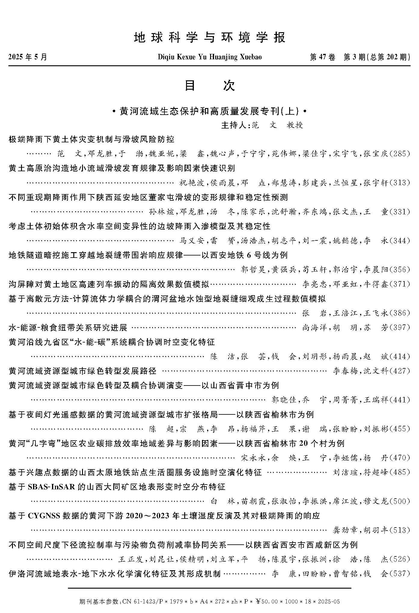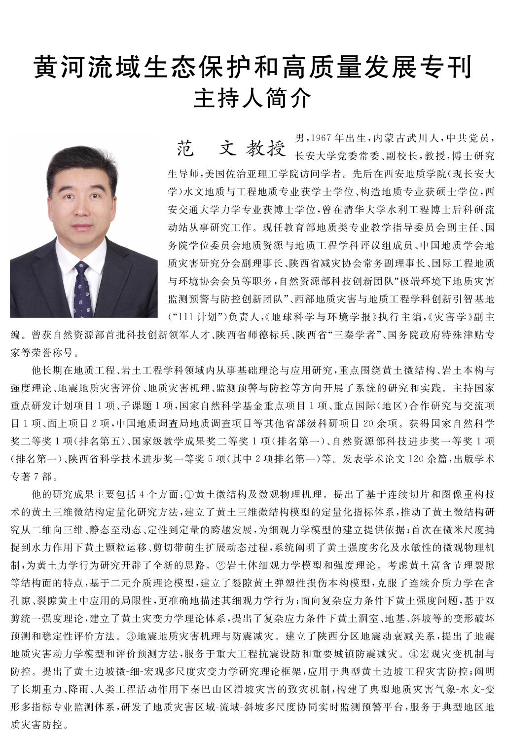本专刊围绕黄河流域复杂地质地表过程、生态环境效应与人地协调、资源型城市绿色转型发展等方面的科学问题开展了广泛报道,分上、下两册(2025年第3期和第4期)共出版38篇高质量论文。其中,范文教授作为专刊主持人,以一作身份发表了题为“极端降雨下黄土体灾变机制与滑坡风险防控”的高质量论文。长安大学、陕西师范大学、西北大学、西安理工大学、西安科技大学、西北政法大学、兰州理工大学、甘肃农业大学、山西师范大学等高校和科研院所为本专刊提供了强大的学术支撑。