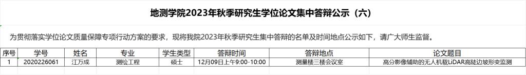 为贯彻落实学位论文质量保障专项行动方案的要求,现将澳门金沙娱乐城app 2023年秋季研究生集中答辩的名单及时间地点公示如下,请广大师生监督。