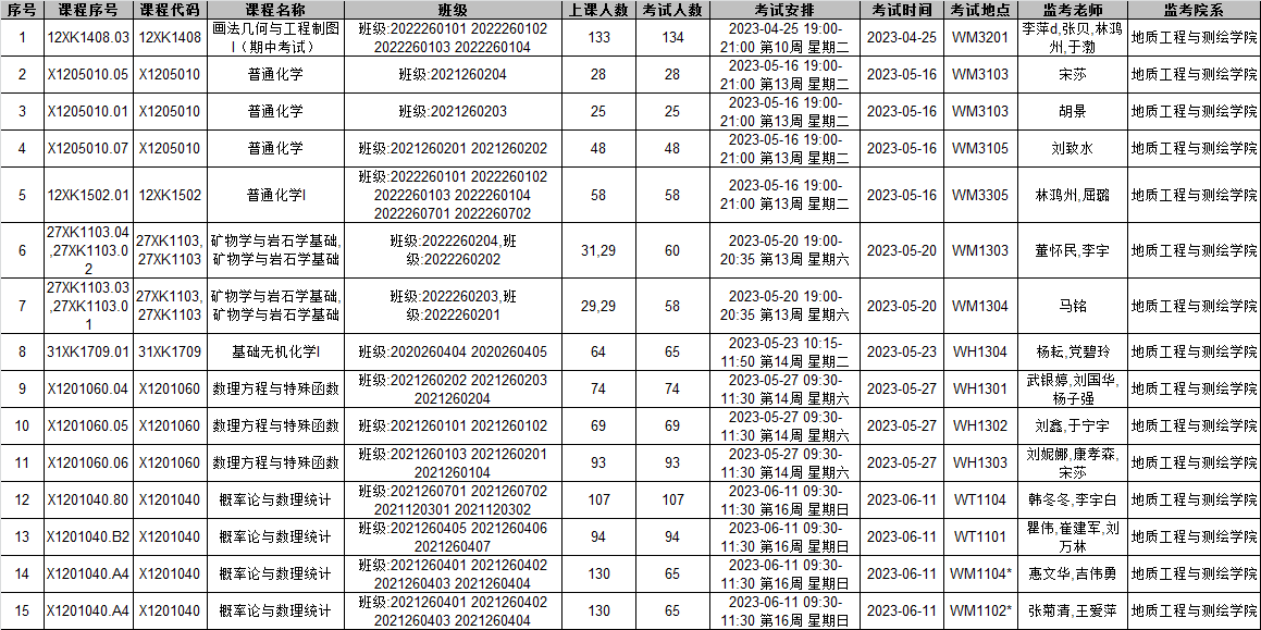 22-23-2学期普通化学、数理方程与特殊函数、概率论与数理统计、矿物学与岩石学基础等期末考试监考安排已发布,监考安排澳门金沙娱乐城app 已经在本科教务系统中填报完成(监考教师可同时在本科教务系统中查看监考安排)。为确保考试平稳顺利进行,澳门金沙娱乐城app 已将相关监考工作安排表格上传到附件中,请各位老师及时下载查阅,并按时完成监考工作。