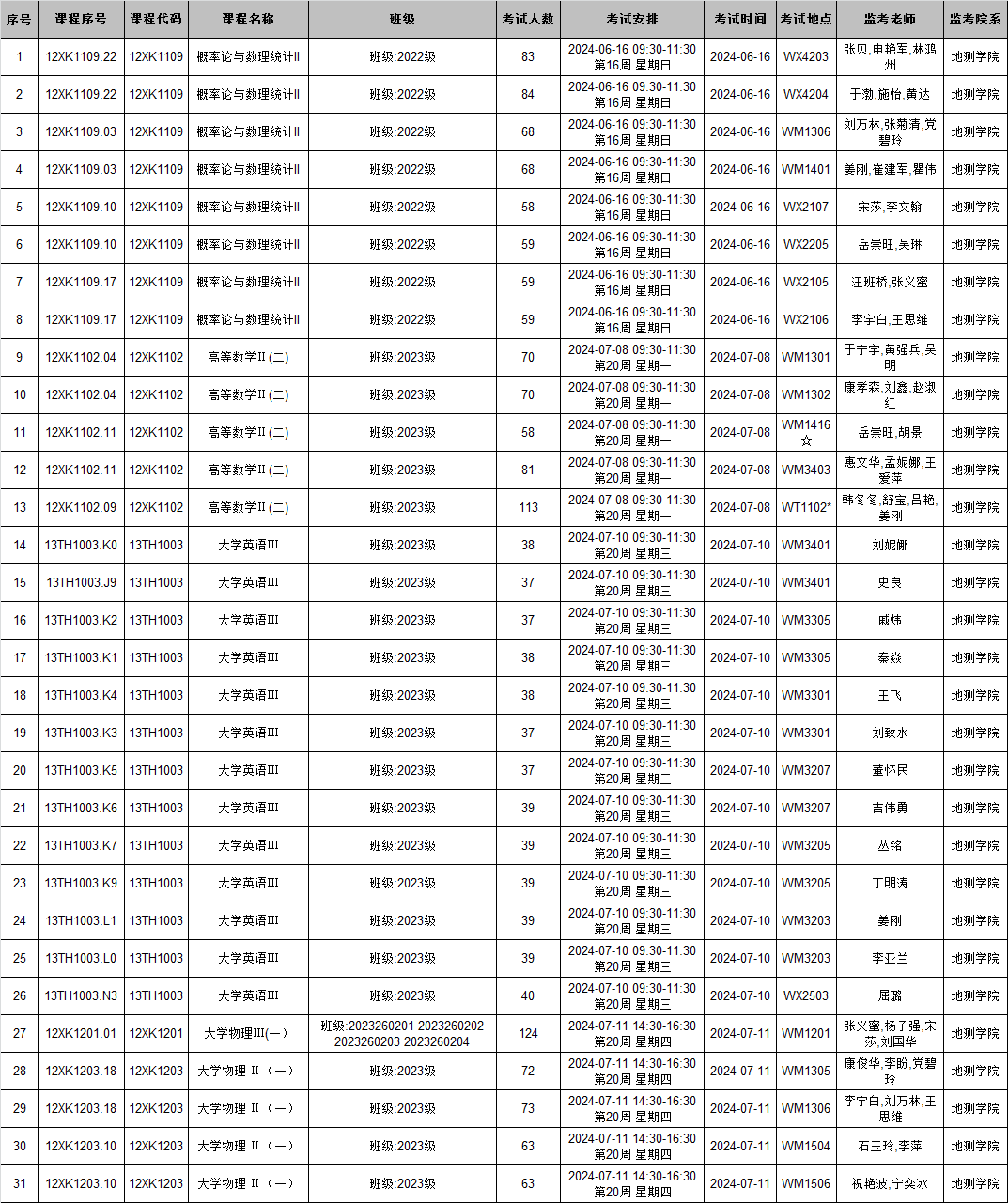 本学期公共课期末考试周考试、概率论与数理统计期末考试监考安排已发布,监考安排澳门金沙娱乐城app 已经在本科教务系统中填报完成(监考教师可同时在本科教务系统中查看监考安排)。为确保考试平稳顺利进行,澳门金沙娱乐城app 已将相关监考工作安排表格上传到附件中,请各位老师及时下载查阅,并按时完成监考工作。